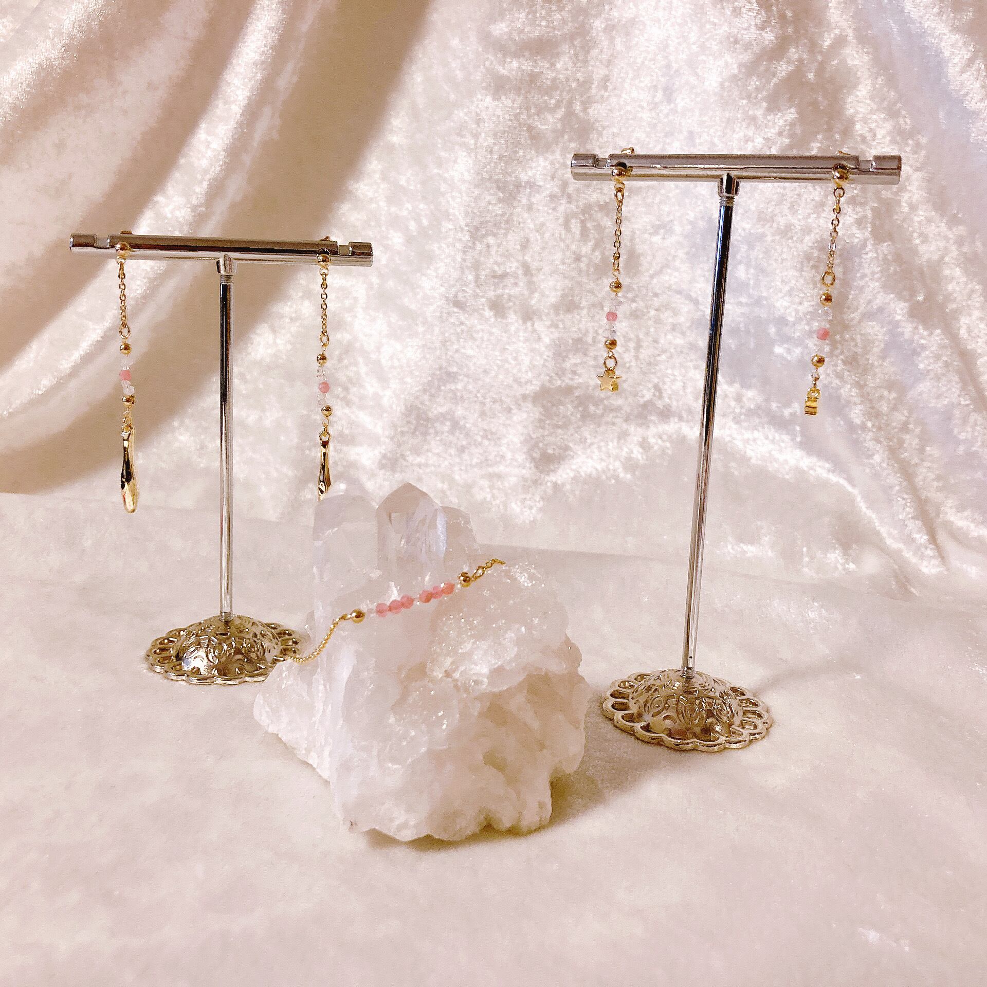 インカローズxハーキマーダイヤモンドのコンビで星のイヤリングを作りました。